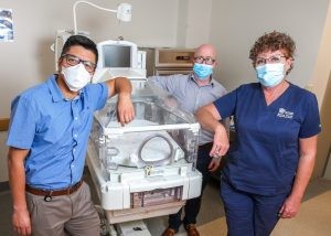Pictured: Dr Manuel Bautista Morales, Danielle Briese and Mick Dwane from the Common Good beside Caboolture Hospital’s OmniBed.